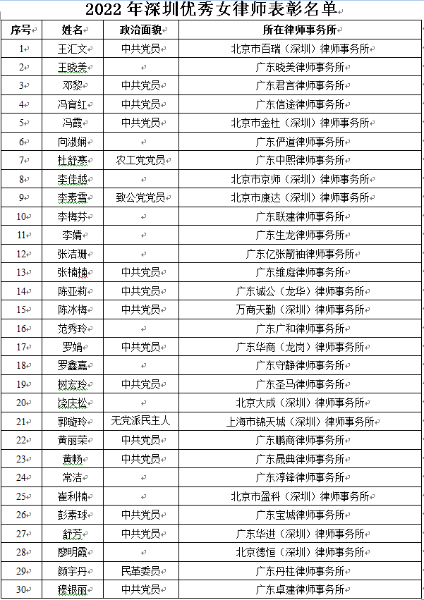 读特客户端·深圳新闻网2022年5月23日讯(记者 张玲 翁任莹)专业敬业、坚韧自信、勇于担当……她们是谁?她们是鹏城律政势不可挡的“她力量”。近日,深圳市律师行业党委和深圳市律师协会决定,对专业能力、服务水平、公益爱心、创新成长等方面表现突出的王汇文等30名女律师授予“深圳优秀女律师”荣誉称号,这也是深圳首次对优秀女律师进行表彰(名单见附录)。