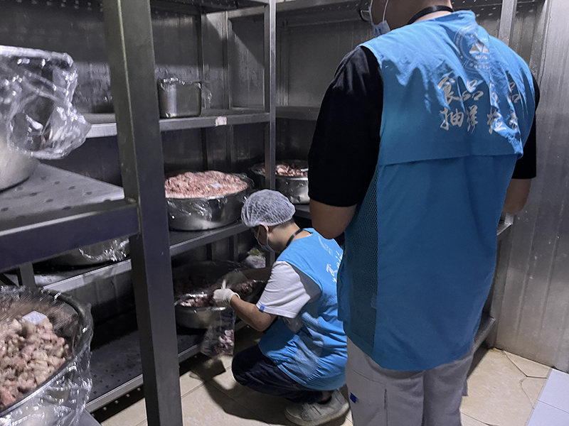 执法行动中,“蓝马甲”快检人员也来到现场,对后厨的蔬菜和肉类等食材进行抽检,检测结果将于数个工作日内公布。