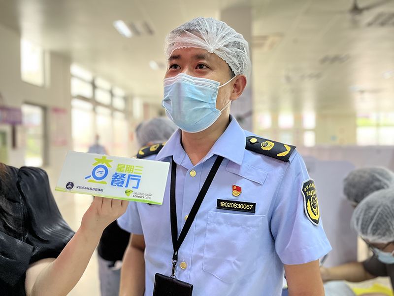 深圳市市场监督管理局坪山监管所食品科执法人员江绍山对今天的执法行动作出总结。他表示,今天总体情况不错,但几处细节还有改进空间。一是刀具砧板可以做进一步的颜色配套管理;二是配餐间的国标工作服与其他区域未做区分,二次更衣方面可改进。“在走完全流程后,发现该食堂不论是加工操作,还是设施设备,管理都较为到位,整体水平仍然维持在A级。”江绍山说道。