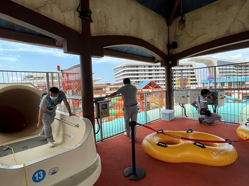 读特客户端·深圳新闻网2022年6月2日讯(记者 胡津玮 牛耘 翁瑞峰 袁征一方)临近端午,为保障广大游客朋友们假期期间出行安全放心,深圳市市场监督管理局大鹏监管局开展“大鹏市监节日查”专项执法行动。本期行动来到了大鹏新区热门景点——金沙湾佳兆业国际乐园水世界,针对这里的证照资质、设施设备、安全管理等情况开展市场经营行为进行重点检查。