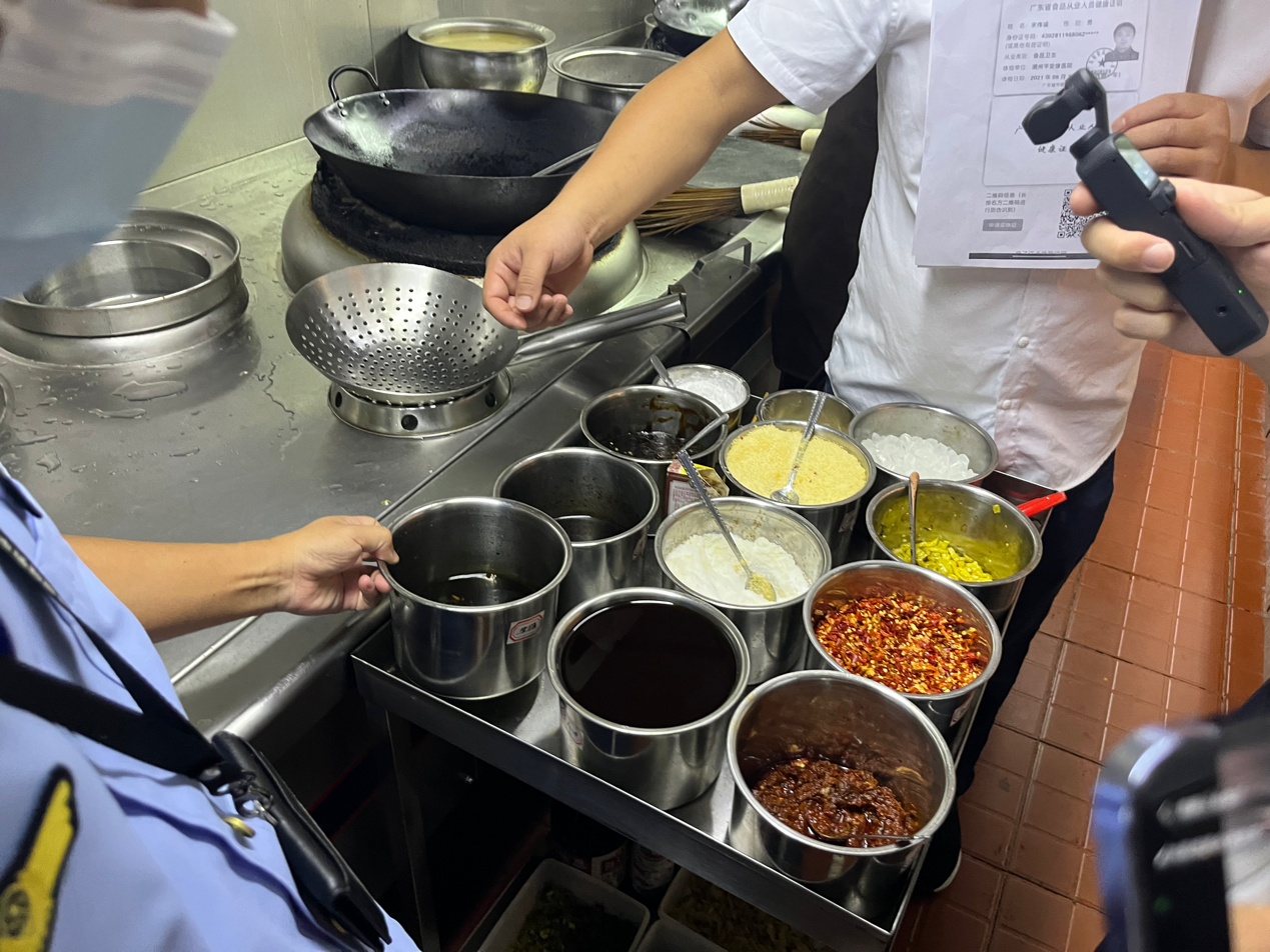 执法人员指出与第一家餐厅同样的问题——在调料区,调料未做任何处理,容器中的调料直接暴露在空气中,食品安全隐患较大。他提醒,当不使用调料时,应加盖或保鲜膜,可防虫蝇等污染,让消费者更放心。