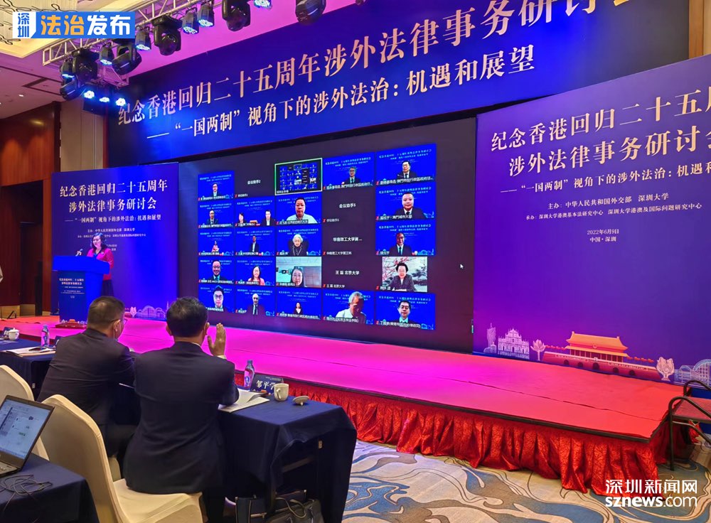 读特客户端·深圳新闻网2022年6月9日讯(记者 张玲 翁任莹)由外交部与深圳大学主办的“‘一国两制’视角下的涉外法治:机遇与展望——纪念香港回归二十五周年涉外法律事务研讨会”6月9日在北京、深圳以线上线下相结合的方式举办。来自港澳和内地的相关部门代表以及专家学者130余人参加研讨会。与会者围绕“香港特区与新时代涉外法治建设”和“更好发挥香港特区在推进国际法治合作中的作用”两大专题六项分议题进行深入研讨。