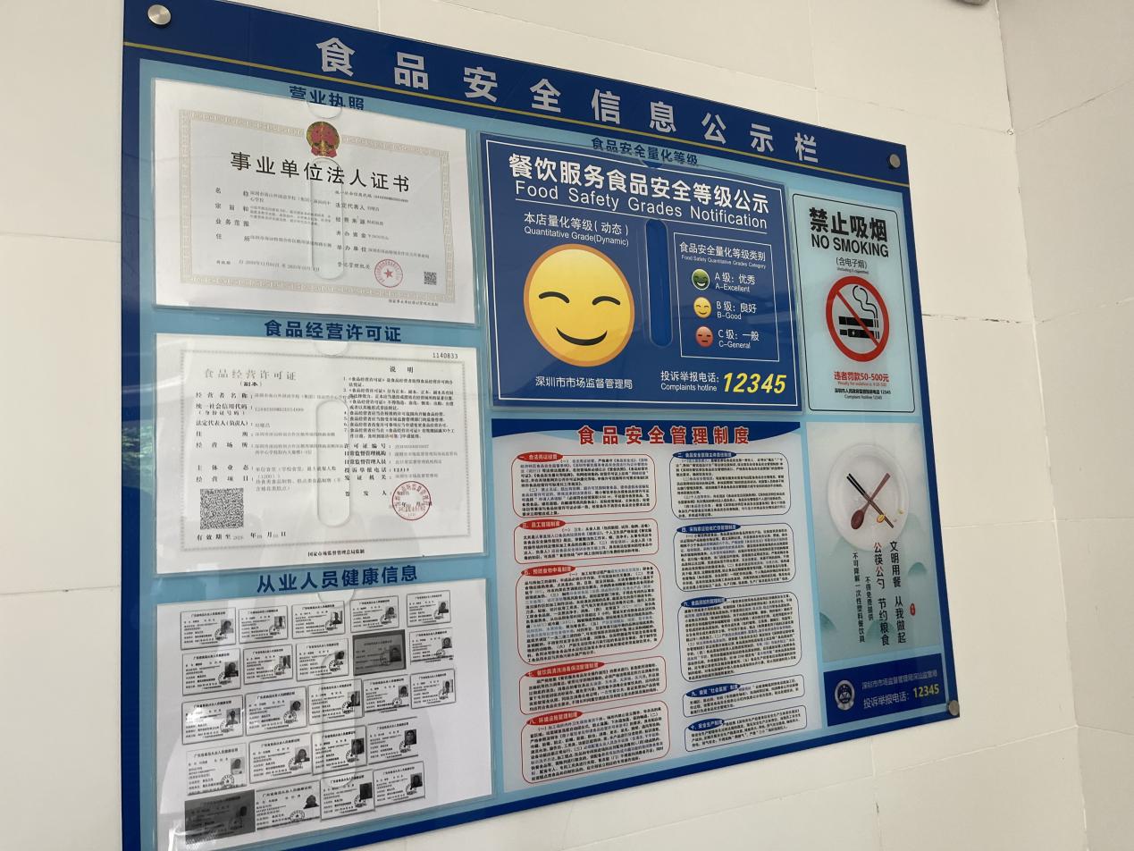 经检查,深圳市南山外国语学校(集团)深汕西中心学校食堂的后厨整体情况良好,学校食堂食品安全管理制度较完善。食堂后厨入口处张贴了食品安全公示栏,过道处张贴有后厨规范标准及食品安全“高压线”等宣传展板。在后厨基础管理系统-表格存放栏处,可查看成品中心温度检测记录、水果间洗消记录、员工晨检记录等信息。
