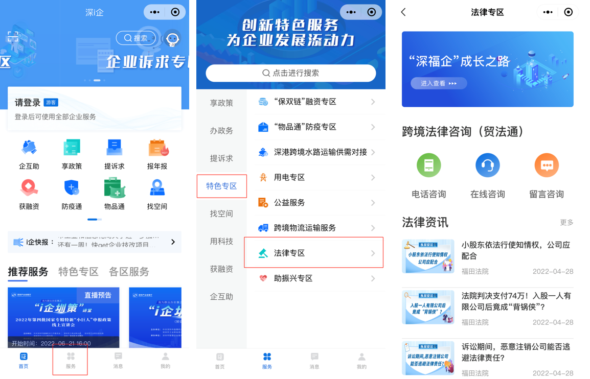 在微信小程序搜索框内搜索关键词“深i企”,点击“服务”—“特色专区”—“法律专区”,即可接入“贸法通”平台。