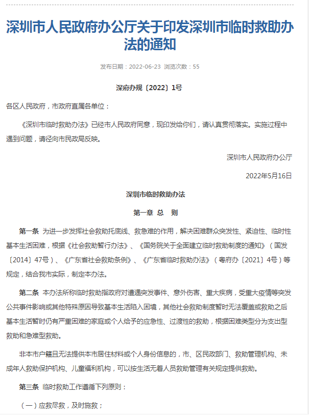读特客户端·深圳新闻网2022年6月24日讯(记者 林玟珊)为进一步完善深圳市临时救助制度,解决居民突发性、紧迫性、临时性基本生活困难,近日,深圳市人民政府印发了《深圳市临时救助办法》(以下简称《办法》)。该办法细化了救助标准、救助类型,并根据困难类型和程度确定临时救助金额。