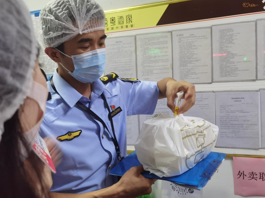 执法人员在该餐厅的外卖取餐处,检查该店外卖是否符合食品安全与疫情防控规范。执法人员表示,所有外卖的封口处都应有封口贴密封,防止外卖被后期打开污染。该店的外卖包装符合规范。