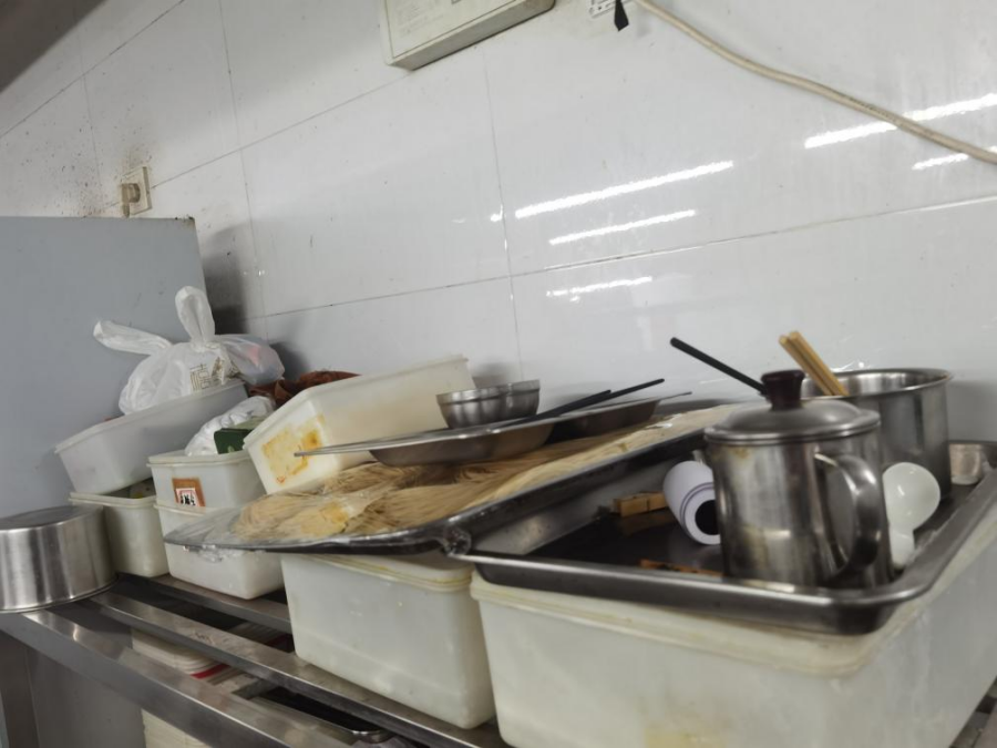 在后厨的一处架子上,记者注意到该店员工的个人物品与食材堆放在一起。执法人员指出,员工的个人物品应与食品分开放置,防止污染。