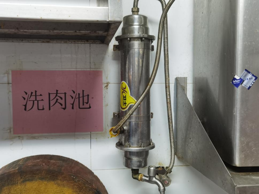 在后厨,执法人员发现,该店的刀具和砧板上并无明显标记区分使用场合。执法人员提醒,刀具和砧板应添加标签,分开存放,避免生熟混用。此外,该店的净水器也应该添加标签,记录滤芯更换时间。
