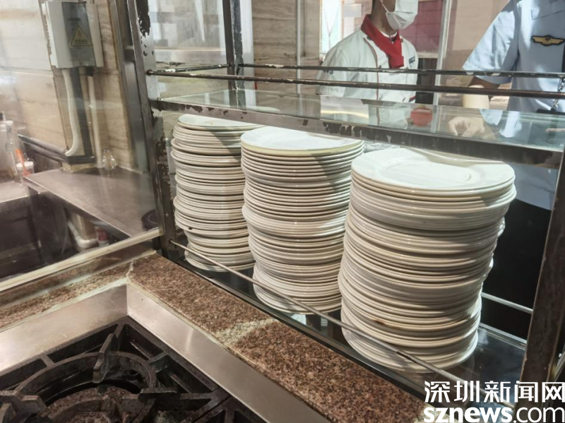 记者跟随着执法人员一同来到了餐厅二楼的后厨进行相关检查。在后厨入口处,执法人员发现该餐厅的砂锅和底碟都堆放在一起,裸露在空气中。执法人员指出,餐具应存放在保洁柜中,避免污染。