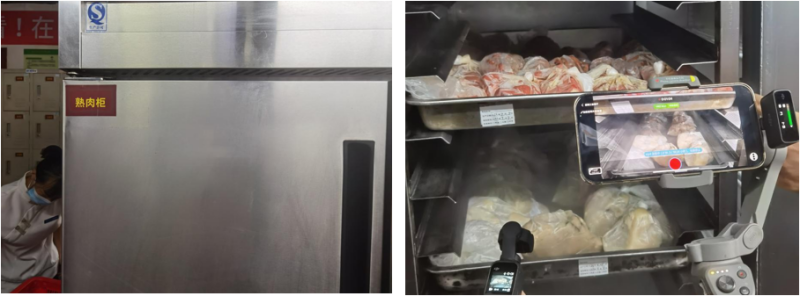 在检查后厨冰柜过程中,执法人员发现标签为“生柜”的冰柜中存放着半成品。同样的问题也发生在该餐厅三楼的后厨,标签为“熟肉柜”的冰柜中存在生熟肉混放的情况。执法人员提醒,食材应按照冰柜标签存放,做好分类,避免相互污染。