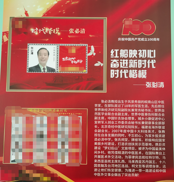 执法人员在现场检查发现,当事人经营场所的墙上贴有“张必清奇经疗法”专题宣传墙纸海报,介绍奇经疗法简介、疗程项目收费及奇经疗法创始人张必清教授资历。奇经疗法的介绍内容写有“《奇经疗法》是国家中医药管理局的百项临床诊疗技术项目”。展示张必清资历画像的其中一处写有“红船映初心,奋进新时代,时代楷模——张必清”,文字上方附有“庆祝中国共产党成立100周年”庆祝活动标识;另一处写有“领航新时代·共和国之子”,文字旁附有国家领导人画像,同时以“中国邮票”的样式展示张必清、袁隆平、钟南山在内多位人物形象。