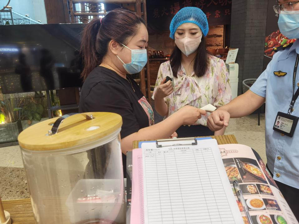 根据疫情防控要求,所有人员进入餐厅前需要进行消毒、测温、登记。执法人员检查了该餐厅员工的健康码,均有24小时核酸,符合防疫要求。