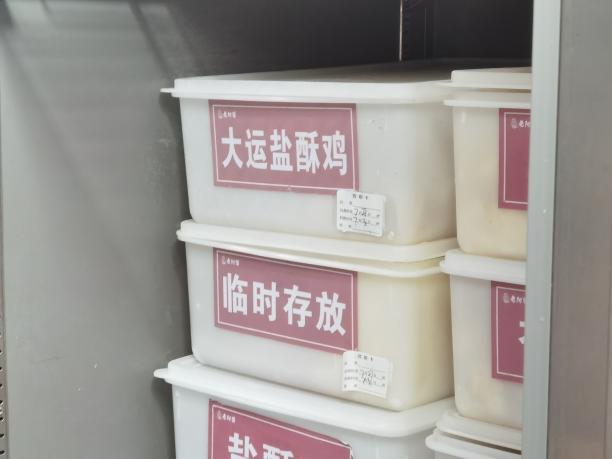 半成品冰柜中的食材分类摆放,使用时间和到期时间标识齐全。执法人员对此表示肯定。但在保洁柜中同样出现了员工个人物品和餐具混放情况,需要整改。