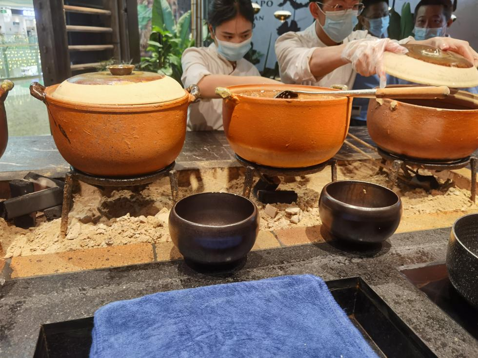 在该餐厅的开放式厨房,后厨工作人员演示牛腩制作流程。制作过程中,食材紧挨砂锅放置。执法人员建议将食材远离碳火,做好卫生防尘工作。