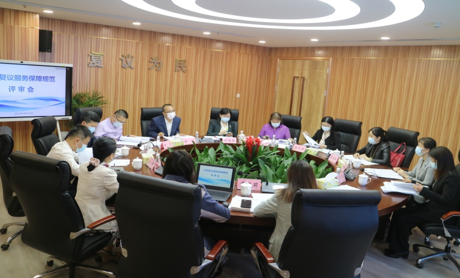 2022年4月19日,深圳市司法局副局长徐鹏主持召开《行政复议服务保障规范》专家评审会。(深圳市司法局供图)