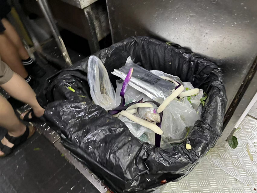 在餐厅后厨,记者看到地面积水积油导致湿滑,整体环境较为混乱。执法人员指出如下问题:一是垃圾桶未加盖;二是冰柜摆放杂乱,荤素混放,散装米粉无标签日期;三是保洁柜未启用,餐具表面有水渍,也未经消毒。此外,二楼仓库未安装通风设施,需尽快改进。