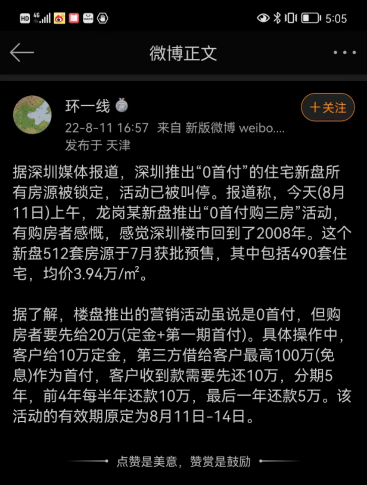 读特客户端·深圳新闻网2022年8月12日讯(记者 田晨夕)8月11日中午,深圳某住宅盘推出了“0首付”购三房的营销活动。活动一开始,中介朋友圈大规模宣传该活动海报,引起不少网友质疑。