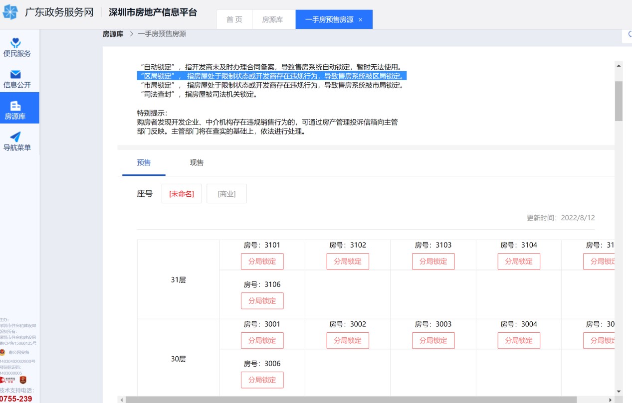 据了解,推出此营销活动的是信城缙悦城项目(备案名信城缙悦花园),活动推出不久后被叫停。目前,深圳市房地产信息平台显示,此项目所有的房源均被显示为“分局锁定”。“区局锁定”指房屋处于限制状态或开发商存在违规行为,导致售房系统被区局锁定。