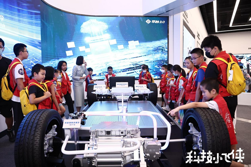 云轨体验结束后,“科技小飞侠”来到比亚迪博物馆,探知汽车世界。博物馆里详细记录了比亚迪汽车的发展历程、科技创新、荣誉资质等内容,看着陌生的世界,小飞侠们走走看看,不时也会提出“汽车只能加油吗?”“新能源汽车如何运作?”等问题,在讲解员及比亚迪工作人员的耐心解答下,小飞侠们深入了解了汽车的有关知识,打开了通往汽车世界的大门。