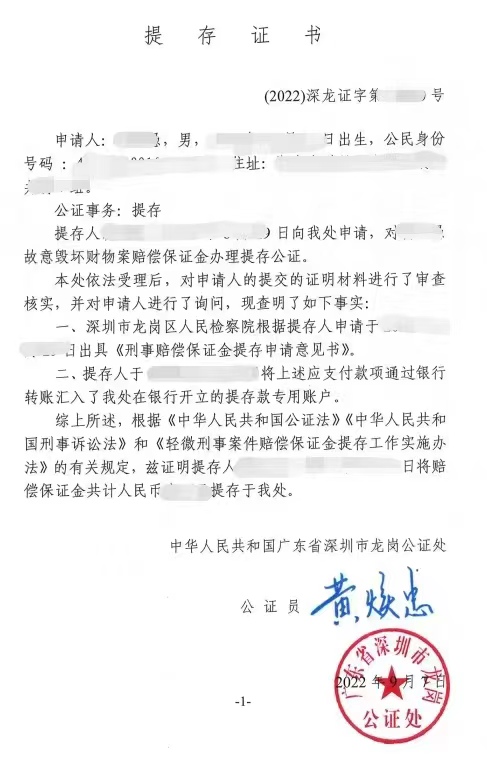 读特客户端深圳新闻网2022年9月13日讯(记者 张玲 通讯员 王小军)日前,一犯罪嫌疑人因涉嫌故意毁坏财物被刑事羁押,该嫌犯自愿承担赔偿责任,但暂未与被害方达成赔偿协议。为切实保障当事双方的合法权益,龙岗公证处与龙岗区人民检察院启动赔偿保证金提存协同合作机制,就该案及时出具公证文书,完成赔偿保证金提存工作。