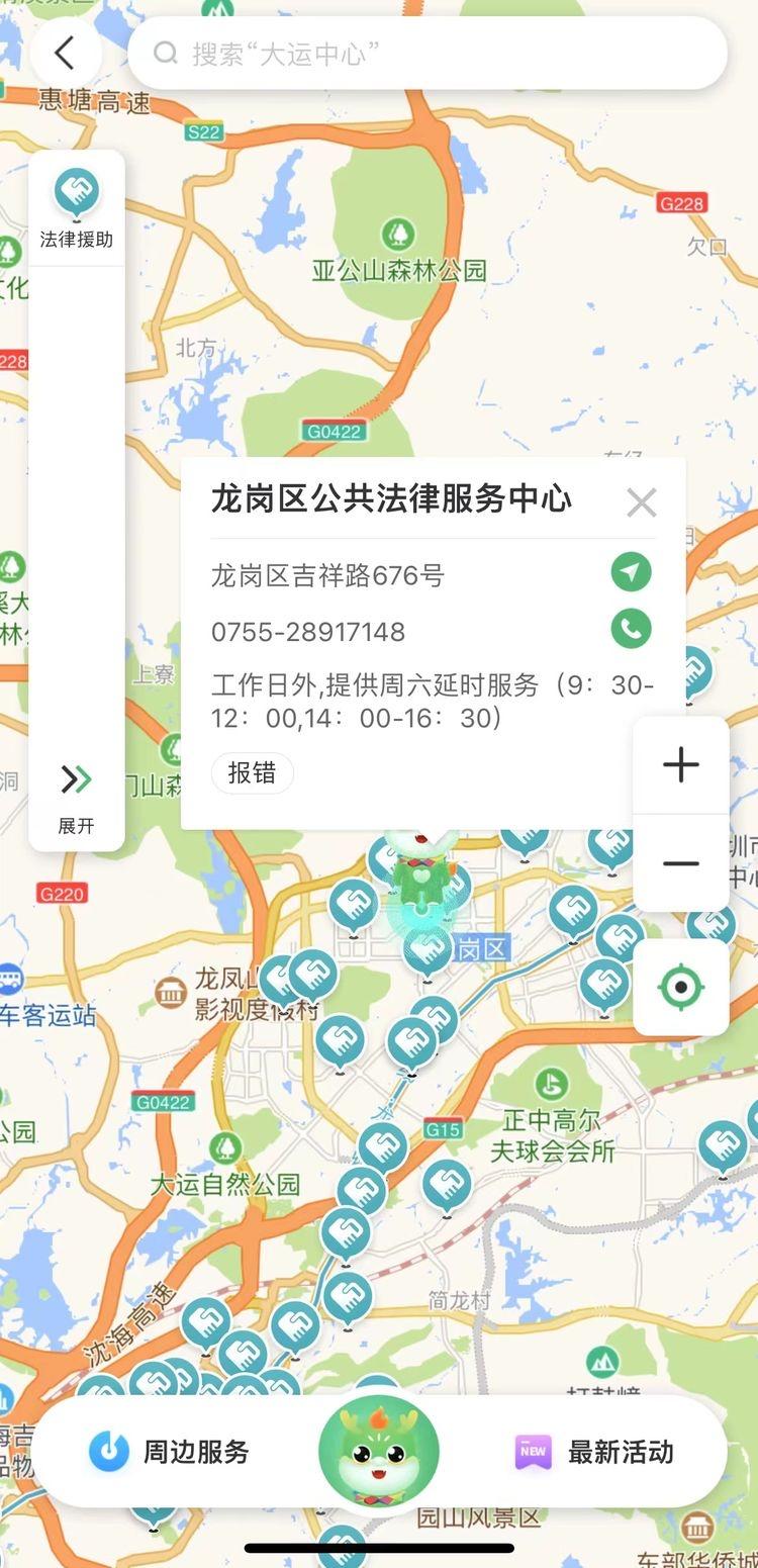 龙岗区司法局联合龙岗区政数局在“i深圳”App平台绘制了全市首张法律援助地图。