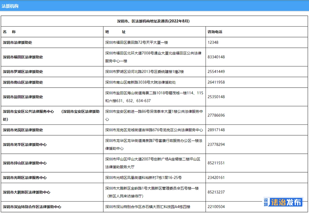 深圳市、区法援机构一览表。(表格来自深圳市司法局)