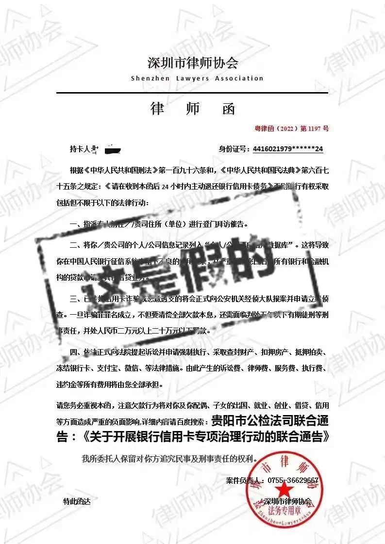 读特客户端·深圳新闻网2022年10月10日讯(记者 翁任莹 张玲)近日,有人假冒“深圳市律师协会”名义发出催收信用卡债务的所谓“律师函”,并盖上“深圳市律师协会”法务专用章。