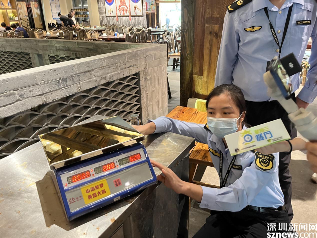 水产区产品均明码标价;在计价称量处,通过称量1kg的标准砝码,执法人员对秤进行检查校准。经查,该餐厅的秤称量准确。
