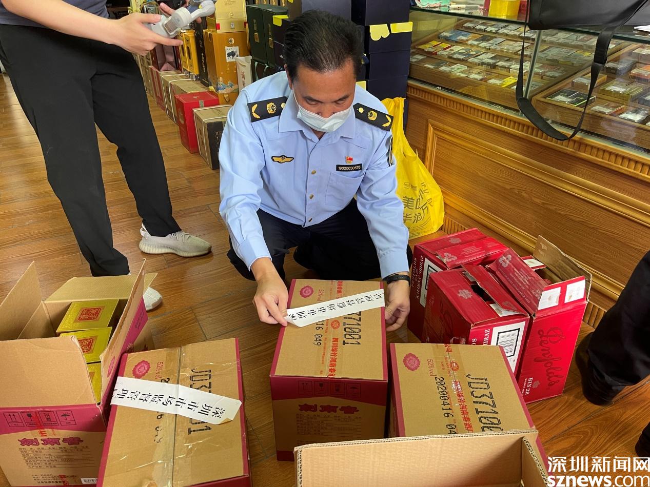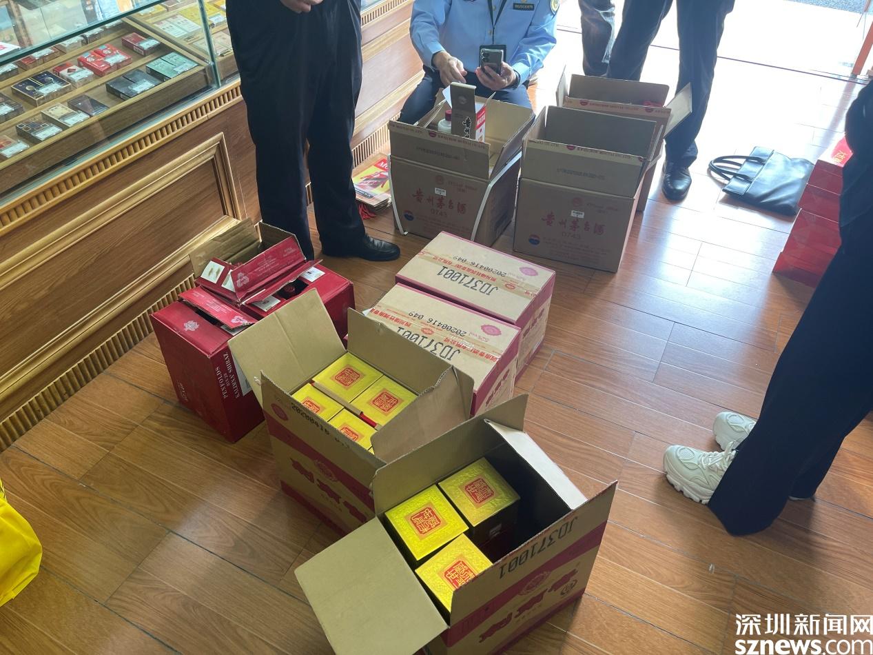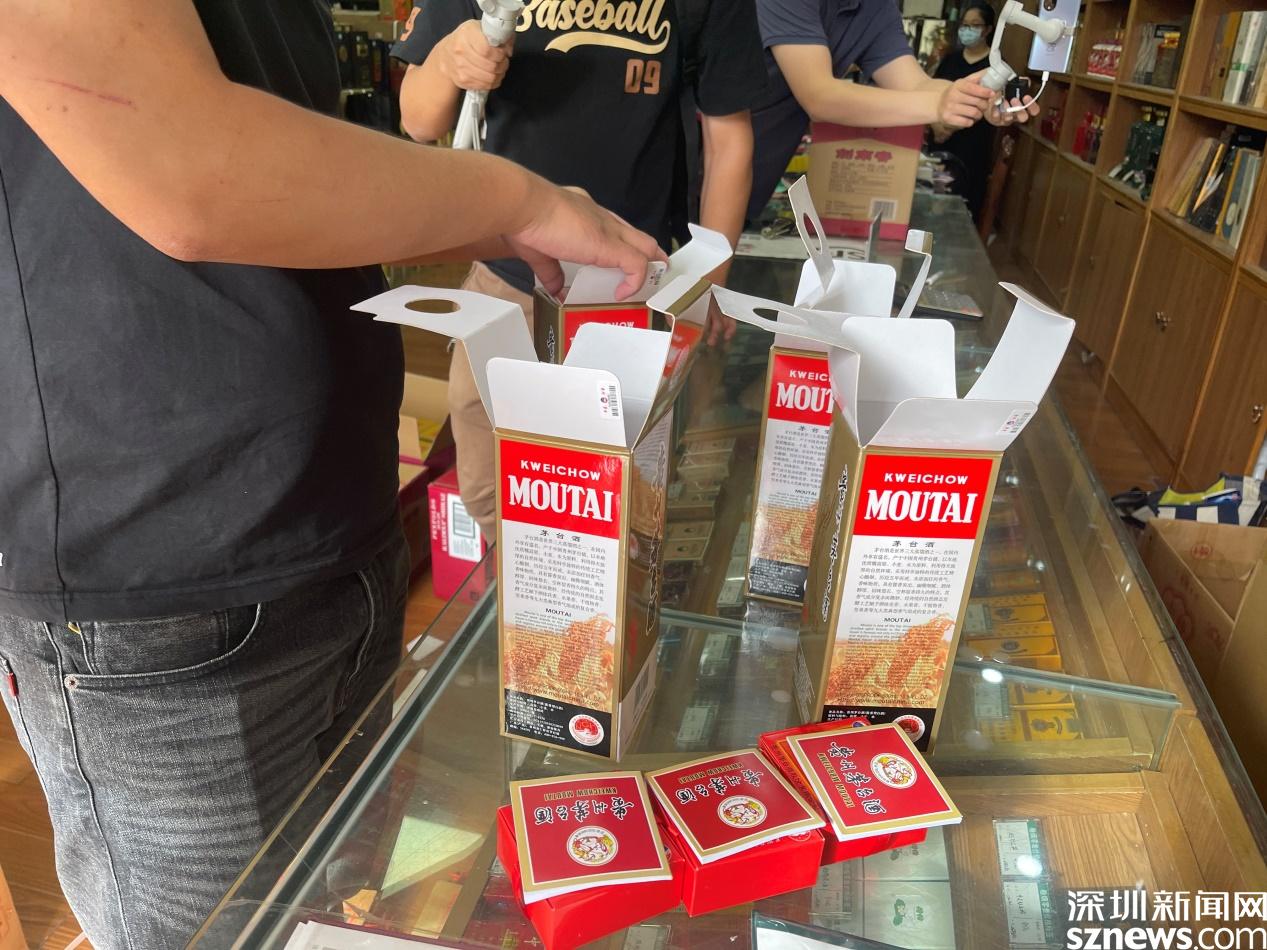 酒水厂商行业专家正在鉴定店内发现的疑似假冒茅台酒。