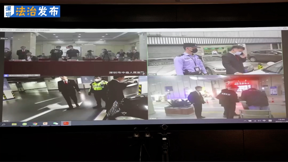 大屏幕显示深圳各区法院连线,实时查扣现场画面。(张宇杰 摄)