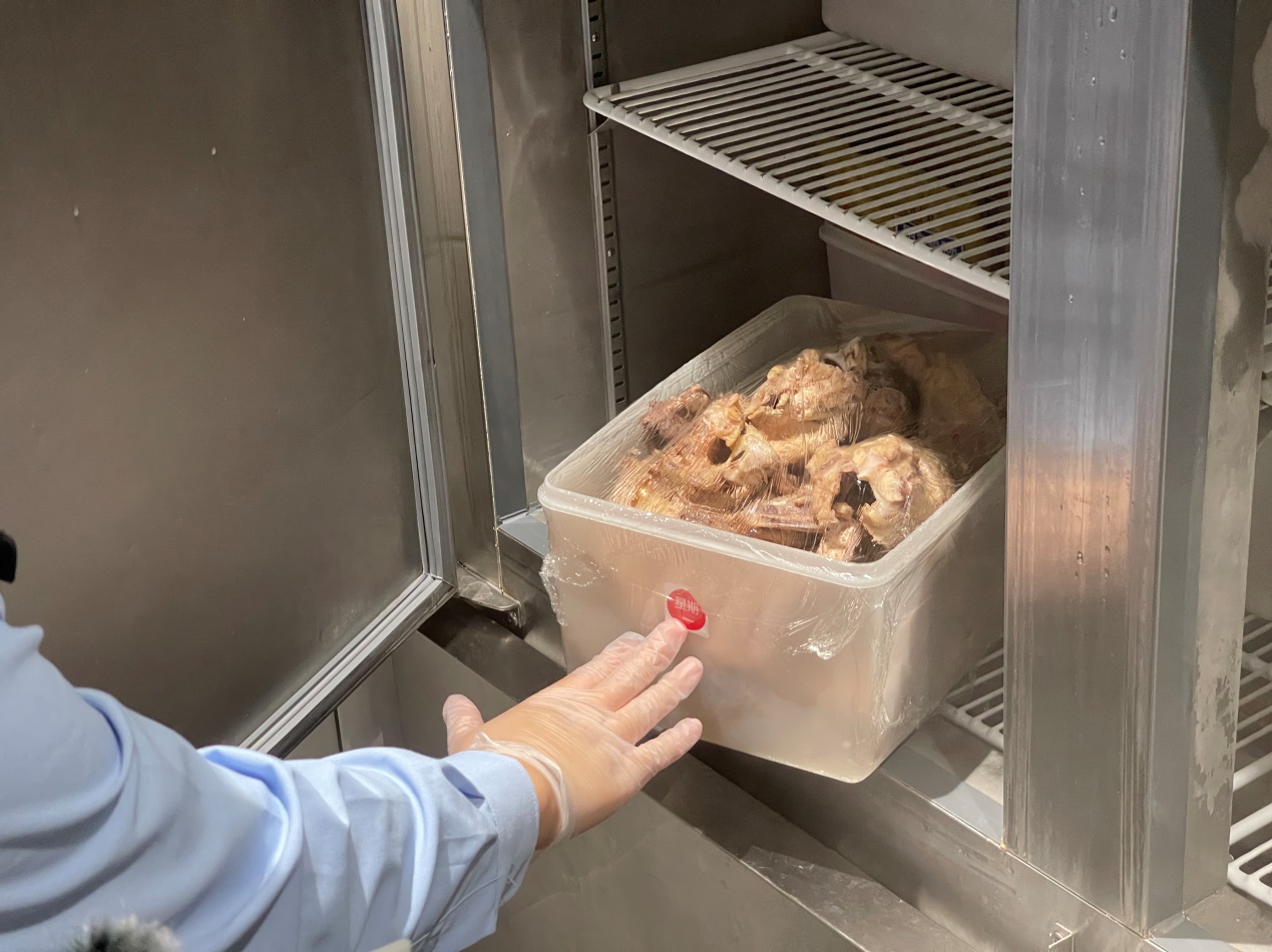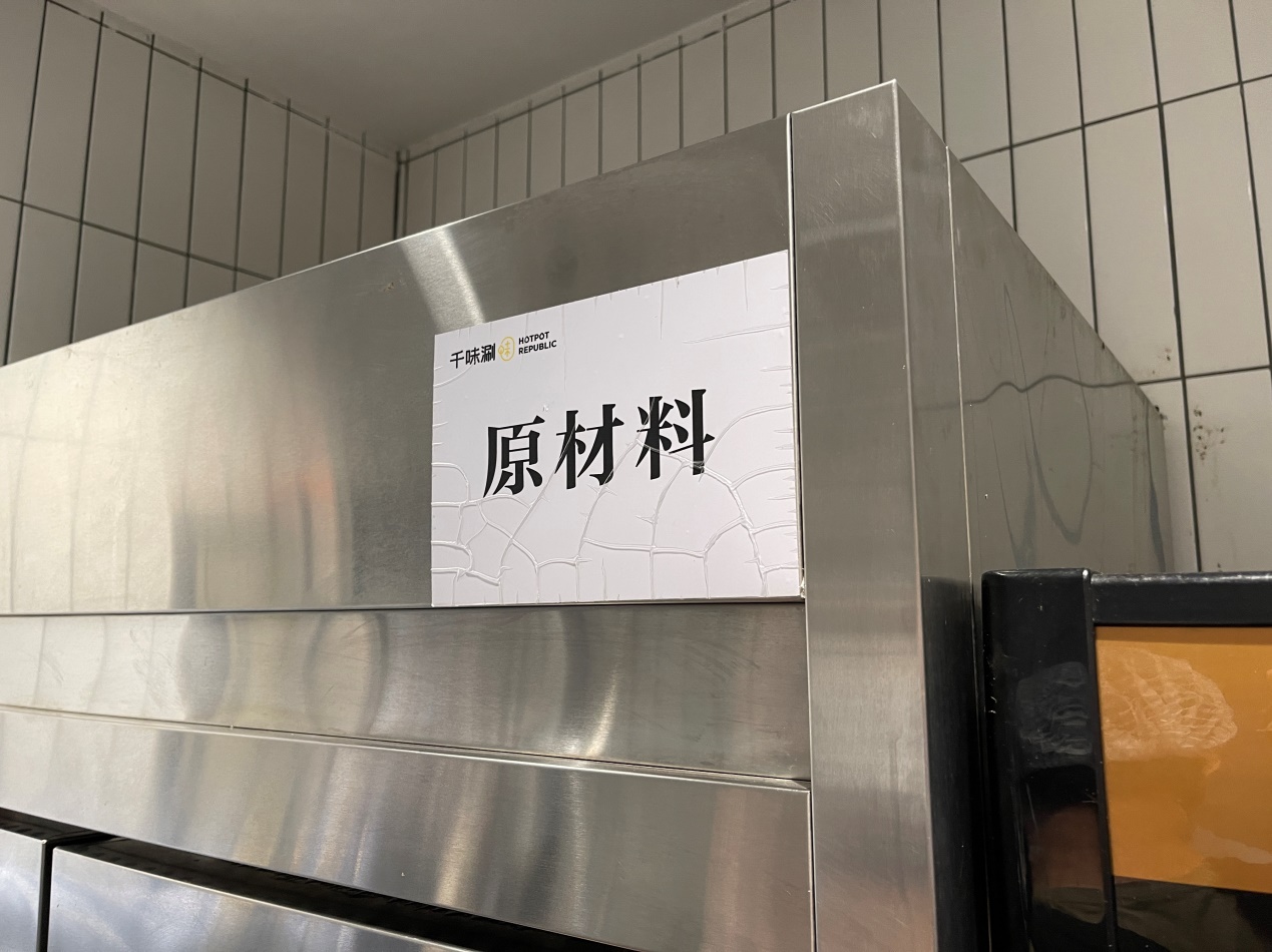 在后厨的半成品冰柜内,执法人员发现原材料仅张贴了标识有星期几制作的标签,缺少品名及保质日期;而冰柜的标签也需要区分半成品原材料和未加工的原材料,防止混放;同时,后厨的保洁区和冰柜存放在同一位置,有污染食物的风险,空间规划需调整。