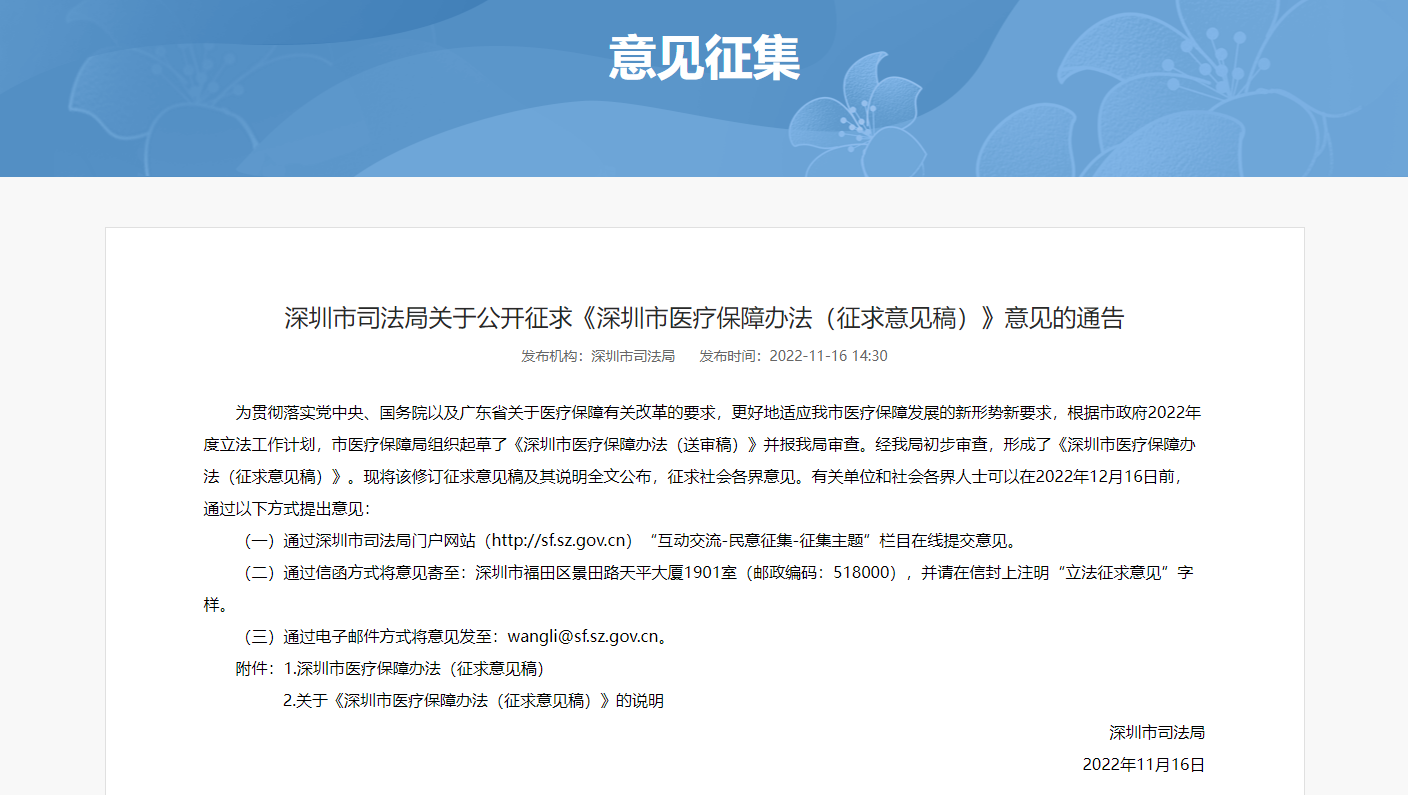 读特客户端·深圳新闻网2022年11月22日讯(记者 翁任莹)近日,深圳市司法局公布《深圳市医疗保障办法(征求意见稿)》(以下简称《办法》)及说明全文,并向社会各界征求意见。