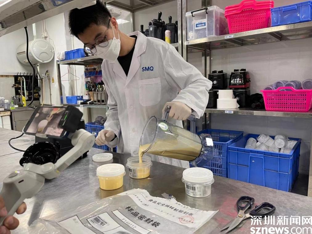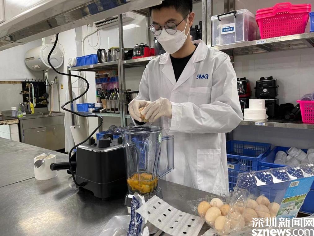 首先是制样环节。来到制样间,检测人员将从市场中抽取回来的每份鸡蛋取出至少10枚敲入杯中。为充分混合均匀,需使用搅拌器进行搅拌,随后分装成三份到洁净的杯子中,其中一份是检验用样,两份是备份样品。