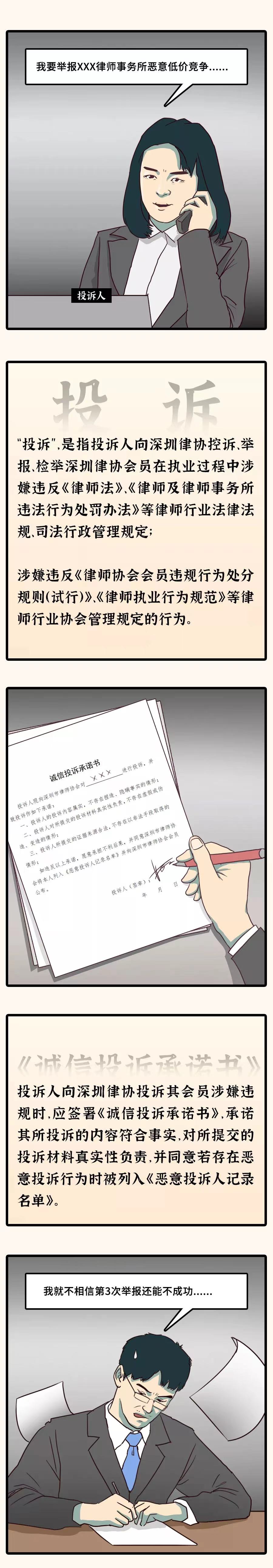 答:投诉人向深圳律协投诉其会员涉嫌违规时,应签署《诚信投诉承诺书》,承诺书包含以下内容:投诉人承诺投诉的内容符合事实;对所提交的投诉材料真实性负责;投诉人所提交的证据来源合法;并同意若存在恶意投诉行为时被列入《恶意投诉人记录名单》。