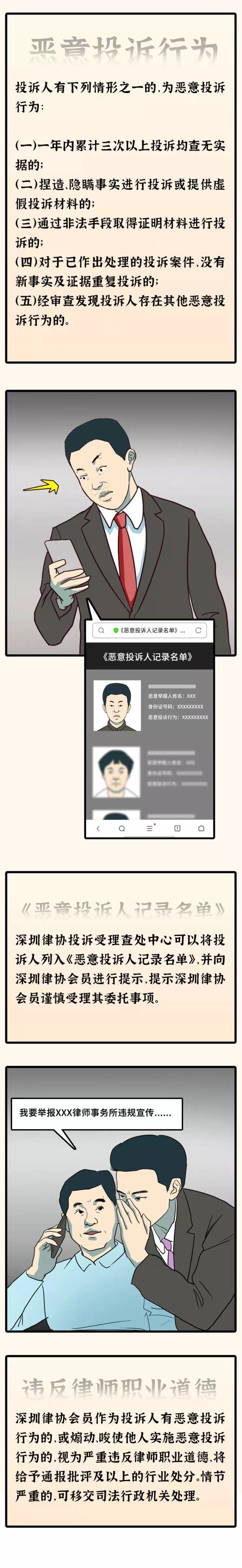 读特客户端·深圳新闻网2023年1月4日讯(记者 翁任莹)2023年1月1日起,《深圳市律师协会恶意投诉行为处理规则(试行)》(以下简称《规则》)正式开始实施,该《规则》于2022年12月16日经十一届市律协第六十五次理事会通讯审议通过。《规则》倡导投诉人必须遵循诚信原则,对进行恶意投诉的投诉人采取相应措施。同时亦明确了因恶意投诉而导致自身权益遭受侵害的会员申请维权的途径,以及对会员煽动、唆使他人实施恶意投诉行为的惩处办法。