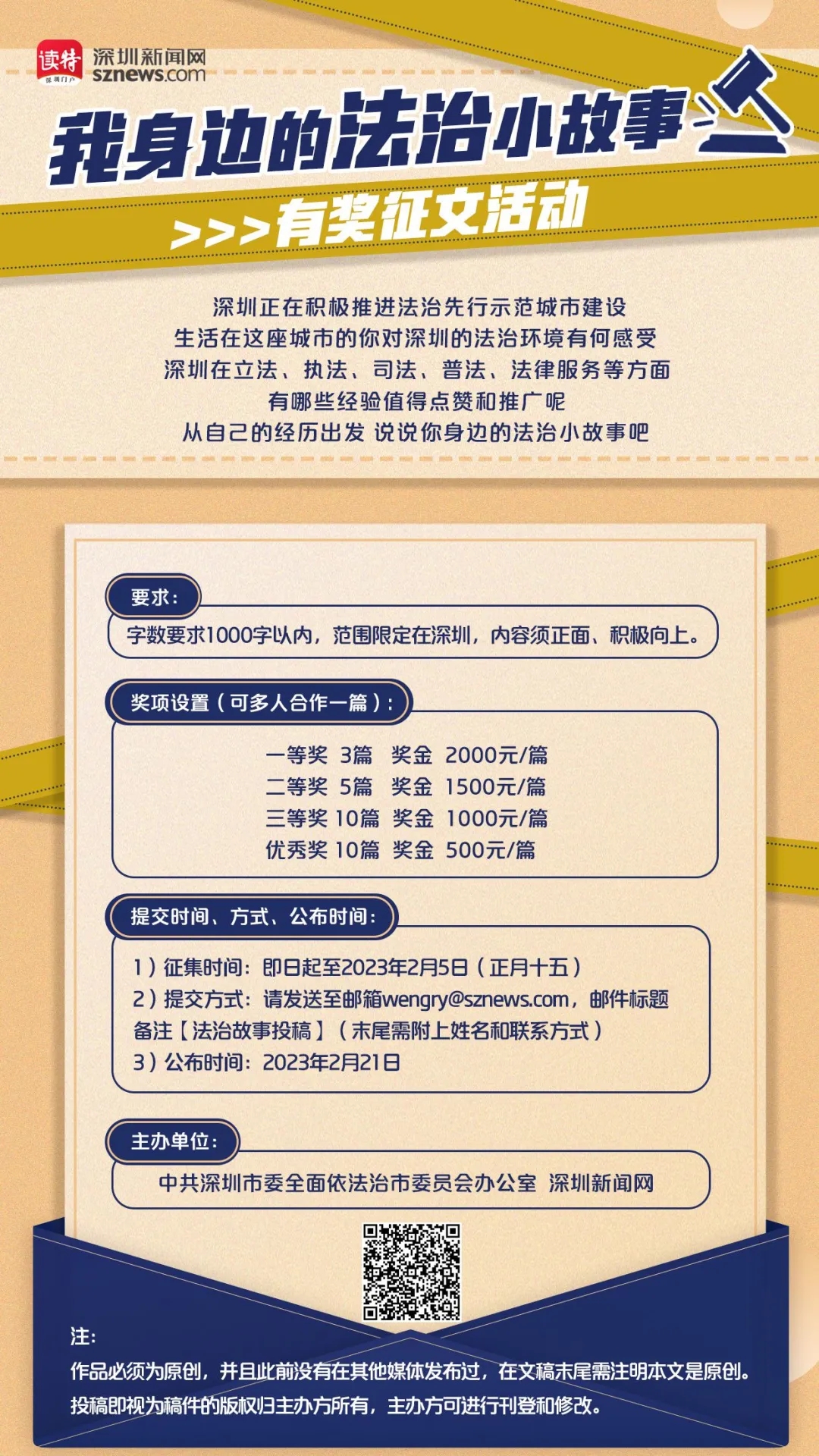 稿件要求原创不得抄袭,范围限定在深圳,内容需积极正面,字数不超过1000字,可发送至邮箱wengry@sznews.com,邮件标题备注【法治故事投稿】(邮件末尾需附上姓名和联系方式)。获奖作品和奖品发放形式将于2月21日公布。