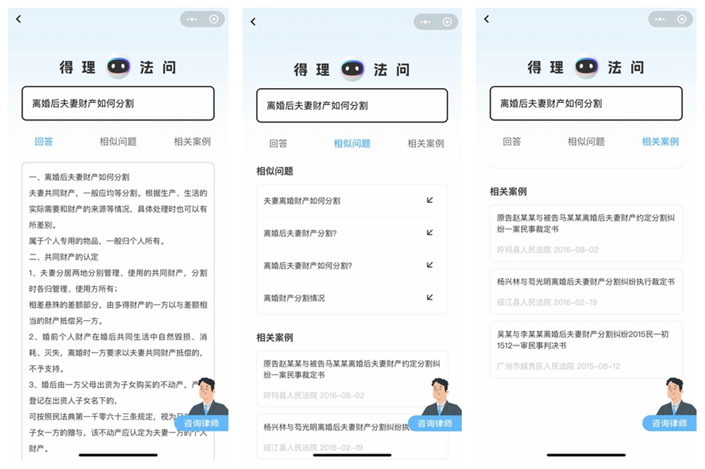 中科院先进院-得理法律人工智能实验室创始人贺倩明在2022年高交会期间接受深圳新闻网记者采访时介绍说,得理法问整合了1亿多份审判文书、300多万份的法律法规以及几十万条的法律知识问答数据,它通过人工智能对数据进行算法训练,加上律师的标注,相当于形成了百度的一个法律专业版——法律类的搜索引擎(有app版,小程序版等)。贺倩明是一名资深律师,有着20多年法律从业经验。据悉,目前,这个搜索引擎已经取得了十几项发明专利。