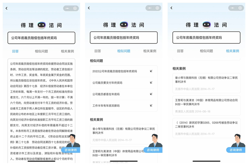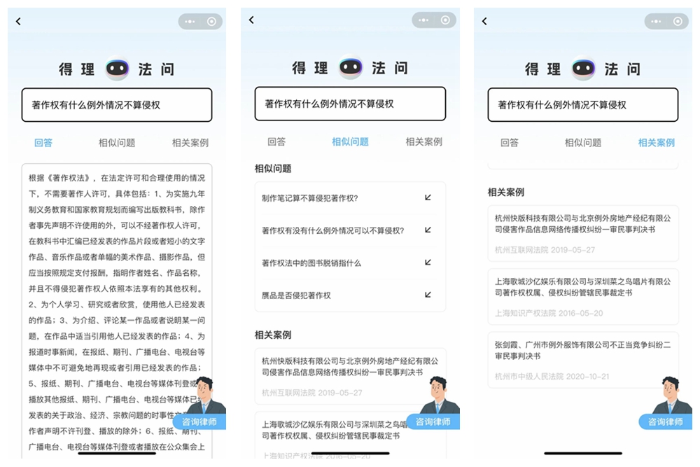 巧合的是,在2022年高交会期间,深圳新闻网记者采访过将人工智能和大数据应用到法律机器人的产品。(相关报道:高交会|为法律插上人工智能的“翅膀”这个法律机器人有点厉害)这款由深圳智造的法律智能机器人-得理法问,正是由国内领先的法律科技公司得理科技,联手中科院深圳先进院,由顶尖法律专家和算法专家历时三年联合研发而成,被视为法律垂直领域的ChatGPT。