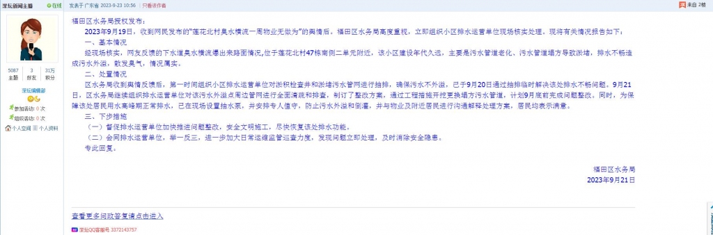 2023年9月19日,收到网民发布的“莲花北村臭水横流一周物业无作为”的舆情后。福田区水务局高度重视,立即组织小区排水运营单位现场核实处理。现将有关情况报告如下: