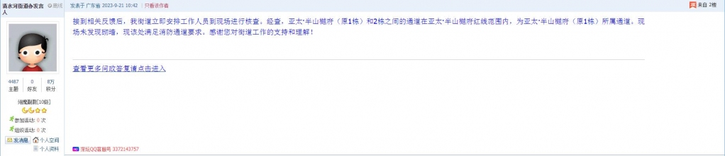 接到相关反馈后,我街道立即安排工作人员到现场进行核查。经查,亚太·半山樾府(原1栋)和2栋之间的通道在亚太·半山樾府红线范围内,为亚太·半山樾府(原1栋)所属通道。现场未发现砌墙,该处满足消防通道要求。