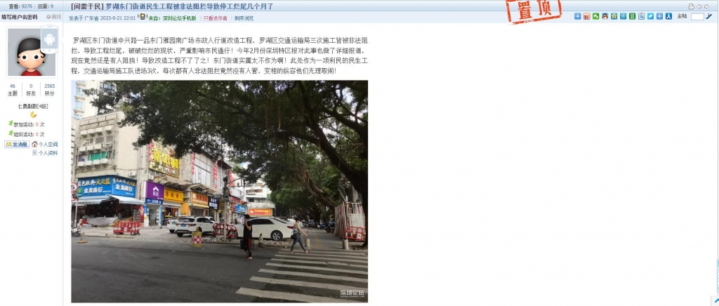 7、帖文《罗湖东门街道民生工程被非法阻拦导致停工烂尾几个月了》