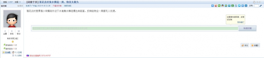 1、帖文《莲花北村臭水横流一周,物业无作为》