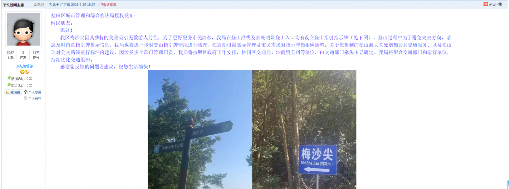 1、帖文《梅沙尖缺少登山指引,有关部门需加以完善》