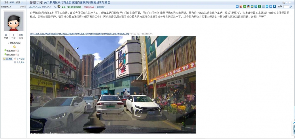 1、帖文《关于罗湖区东门商业街道路交通秩序问题的投诉与建议》
