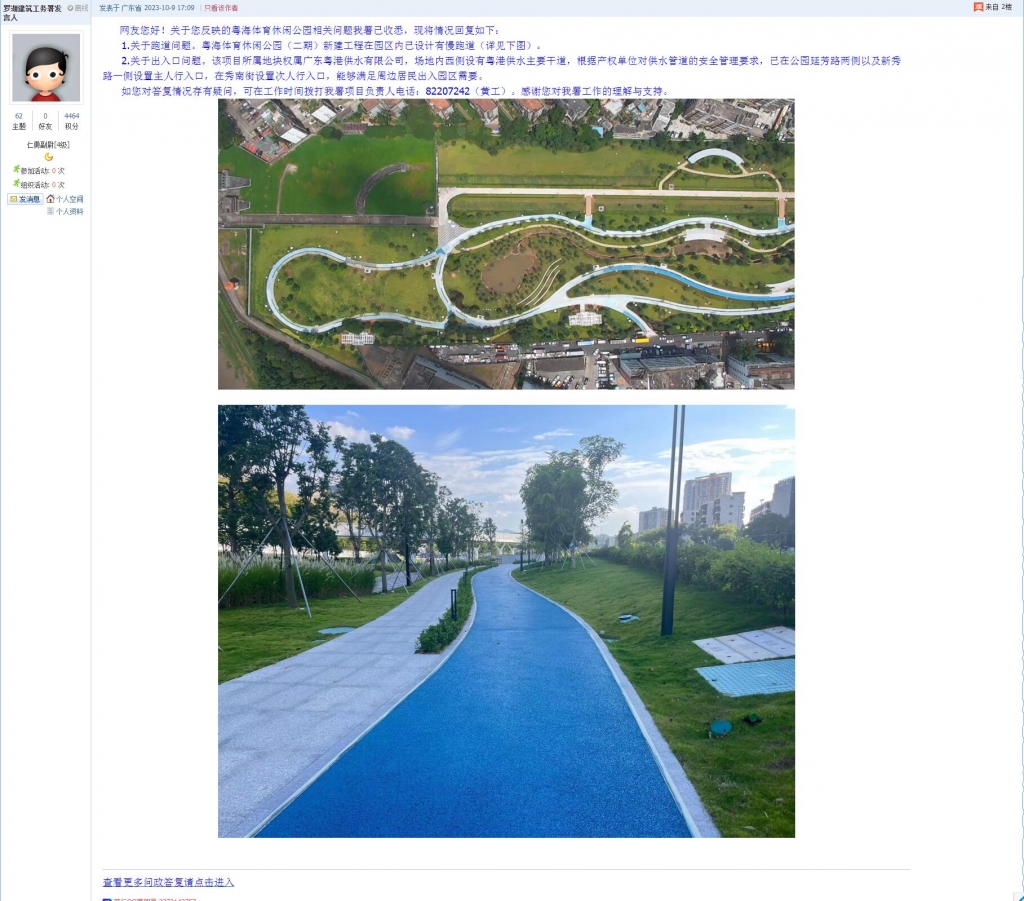 网友您好!关于您反映的粤海体育休闲公园相关问题我署已收悉,现将情况回复如下: