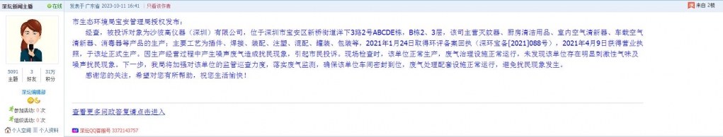 经查,被投诉对象为沙彼高仪器(深圳)有限公司,位于深圳市宝安区新桥街道洋下3路2号ABCDE栋,B栋2、3层,该公司主营灭蚊器、厨房清洁用品、室内空气清新器、车载空气清新器、消毒器等产品的生产;主要工艺为插件、焊接、装配、注塑、混配、罐装、包装等,2021年1月24日取得环评备案回执(深环宝备〔2021〕088号),2021年4月9日获得营业执照,于该地址正式生产。因生产经营过程中产生噪声废气造成扰民现象,引起市民投诉。现场检查时,该单位正常生产,废气治理设施正常运行,未发现该单位存在明显刺激性气味及噪声扰民现象。下一步,我局将加大对该单位的监管巡查力度,落实废气监测,确保该单位车间密封到位,废气处理配套设施正常运行,避免扰民现象发生。
