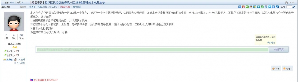 5、帖文《龙华区民治街道樟坑一区183栋管理处水电乱加价》