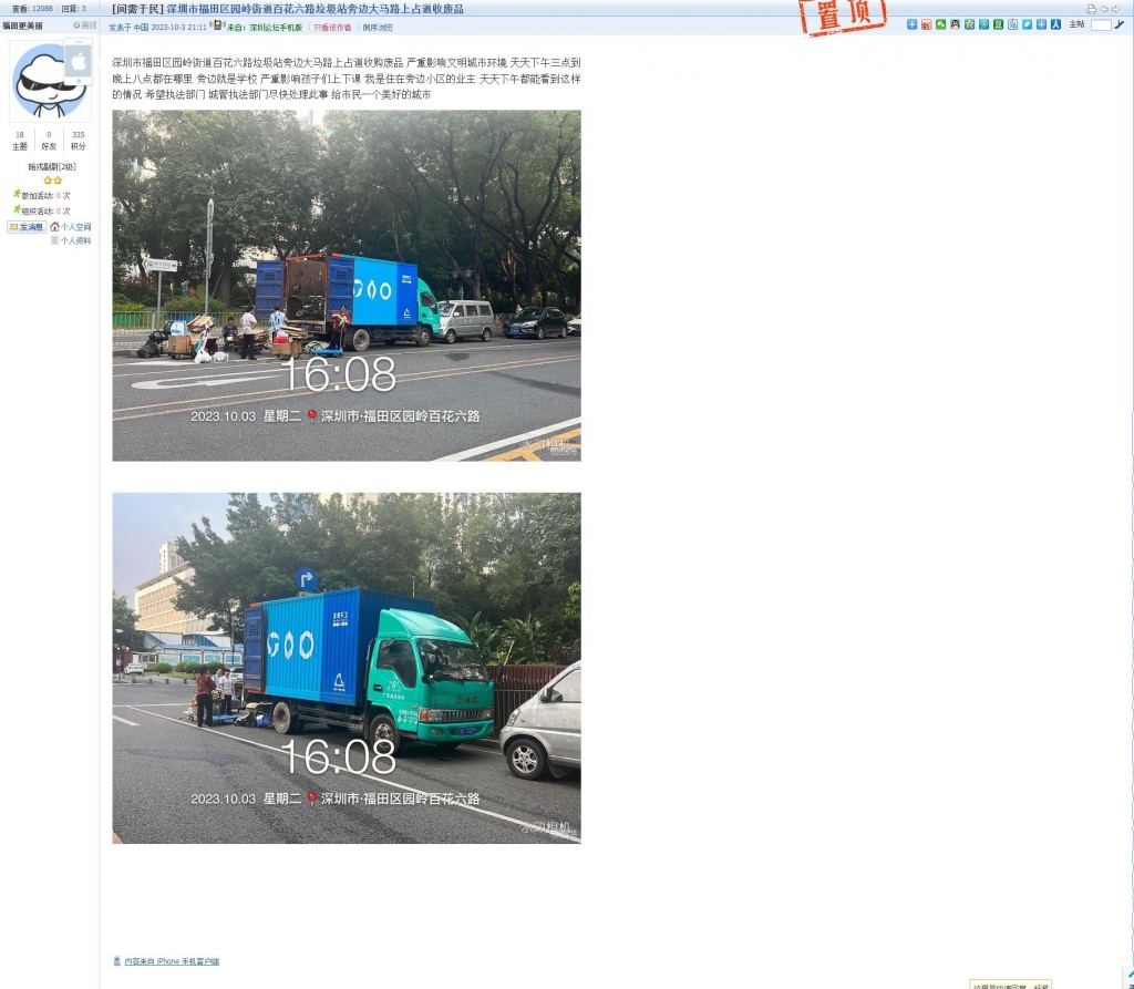 2、帖文《深圳市福田区园岭街道百花六路垃圾站旁边大马路上占道收废品》