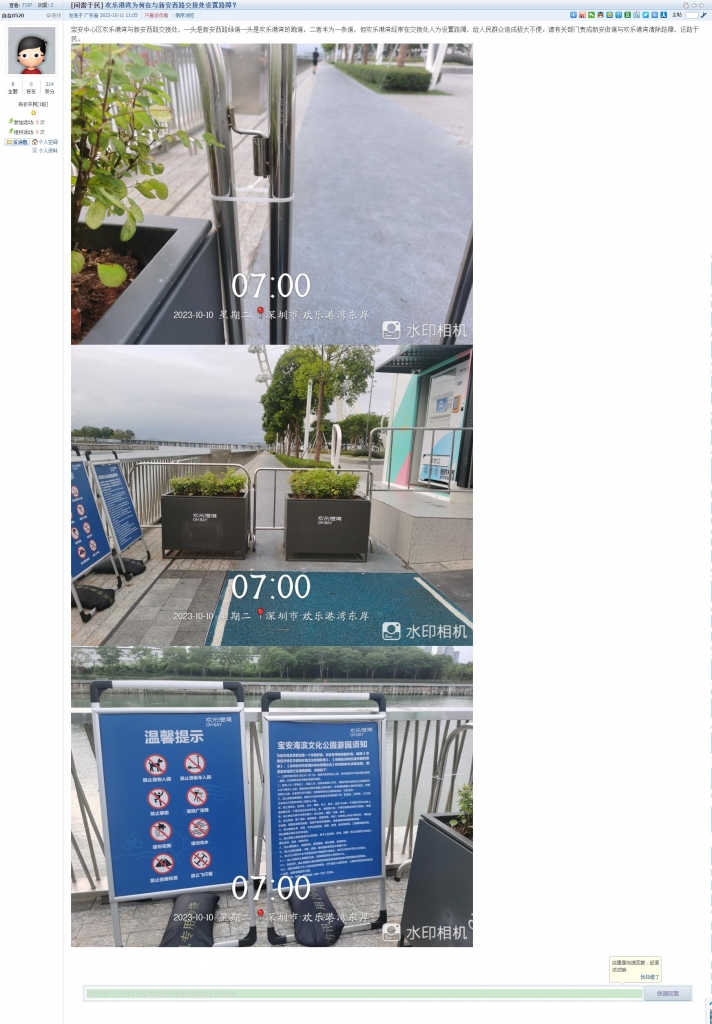 7、帖文《欢乐港湾为何在与新安西路交接处设置路障?》