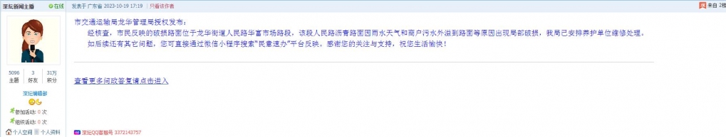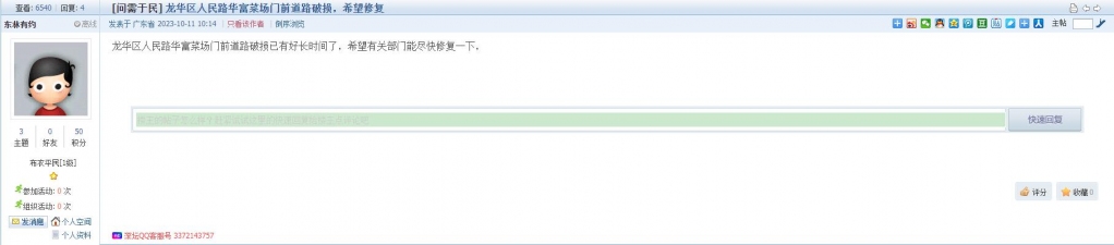 14、帖文《龙华区人民路华富菜场门前道路破损,希望修复》